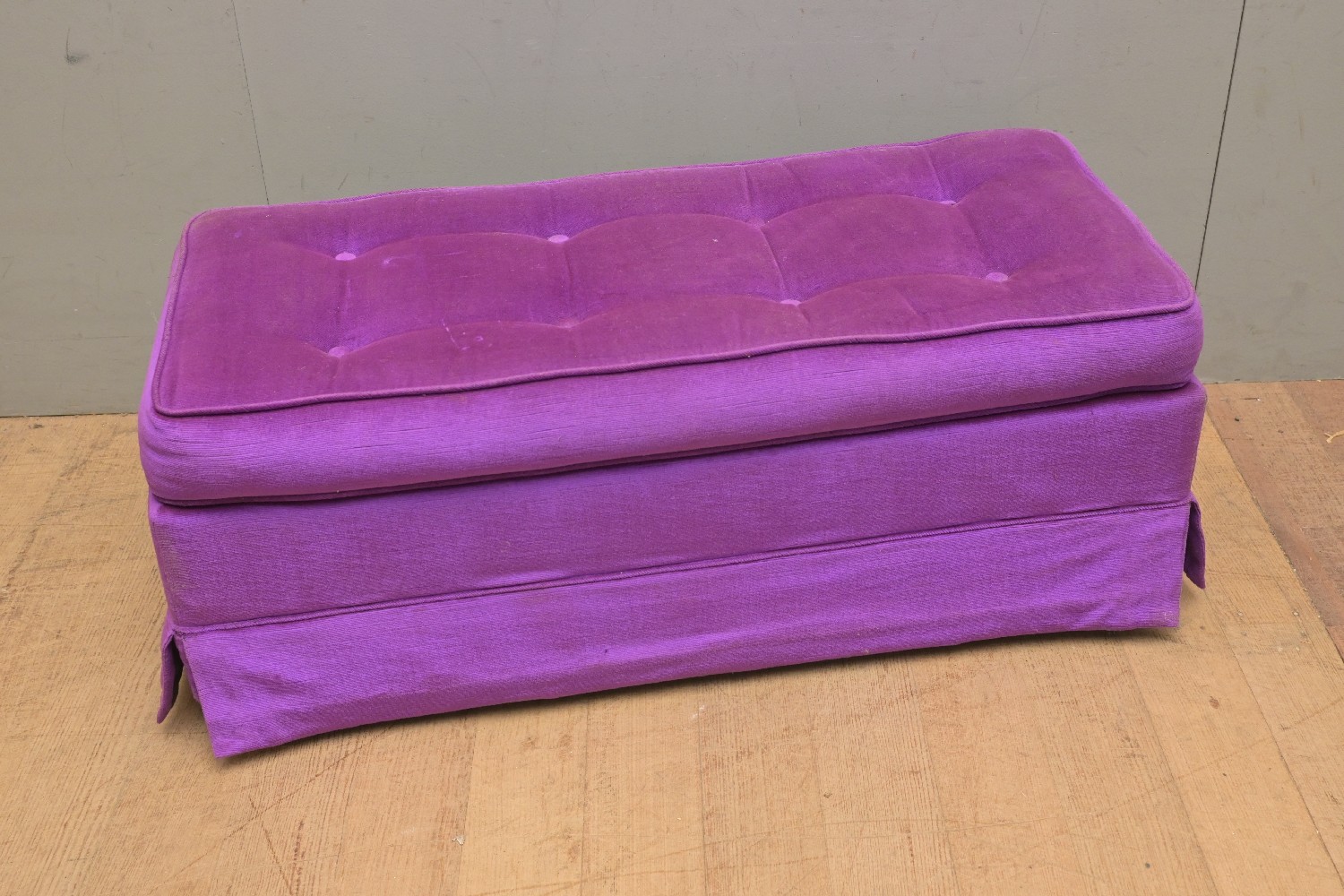 A VINTAGE PURPLE VELOUR RECTANGULAR FOOTSTOOL (A/F) (38H X 96W X 44D CM) (LEONARD JOEL DELIVERY SIZE: LARGE)
