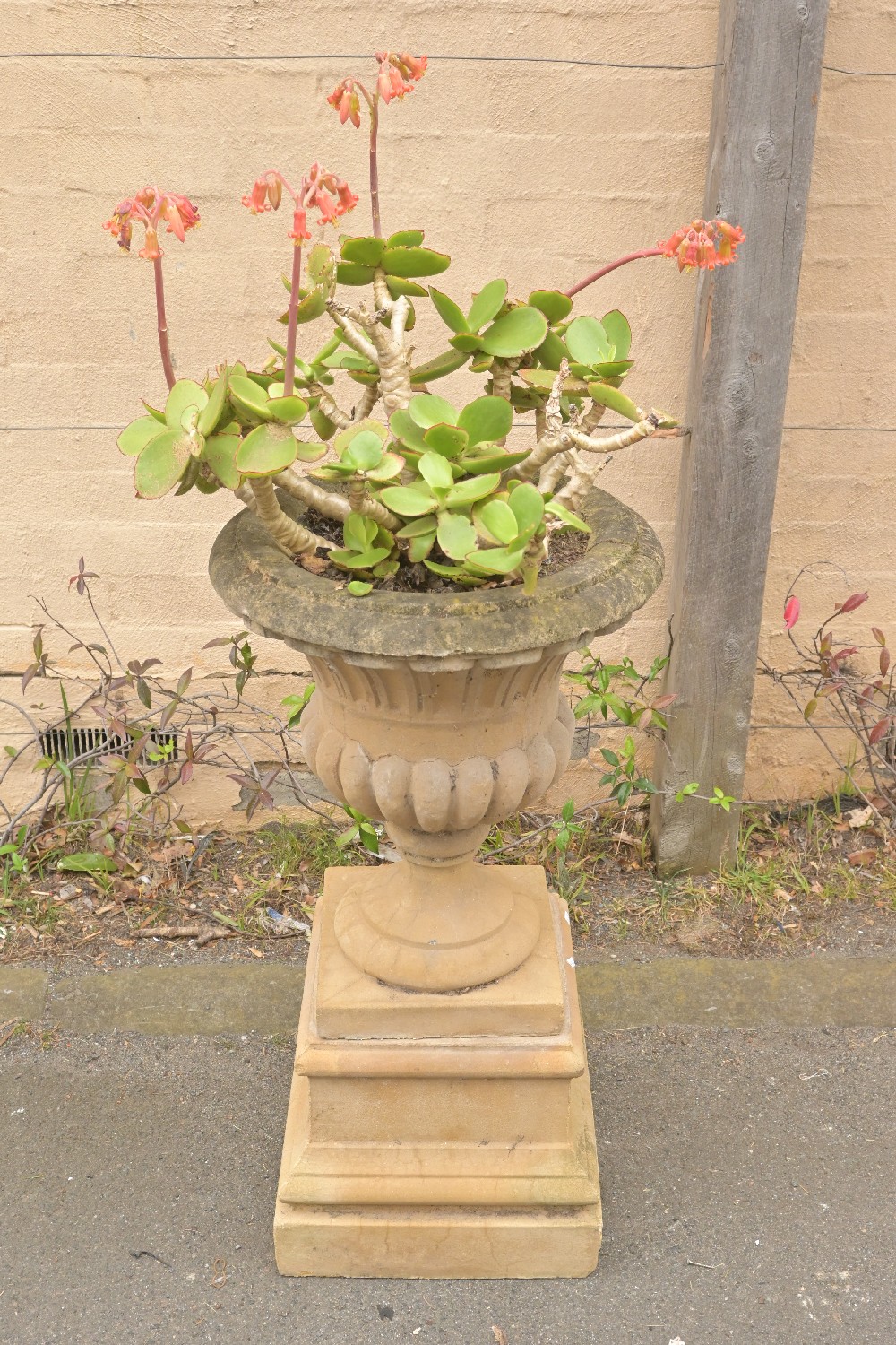 A RECONSTITUTED SANDSTONE POT WITH PLANT ON STAND (A/F) (92H X 47D CM) (THIS HEAVY ITEM MUST BE REMOVED BY CARRIERS AT THE CUSTOMER'S EXPENSE. LEONARD JOEL STAFF WILL NOT ASSIST CARRYING THIS ITEM) (X-LARGE ITEM)