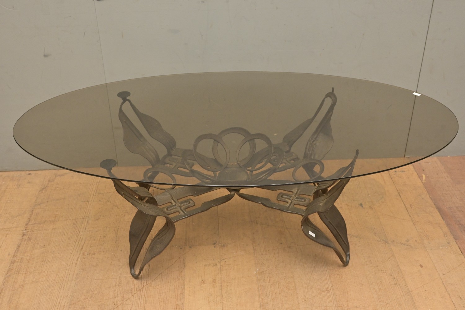 A BRUTALIST STYLE STEEL BASED OVAL GLASS TOPPED TABLE (A/F) (41H X 127W X 66D CM) (LEONARD JOEL DELIVERY SIZE: X-LARGE)