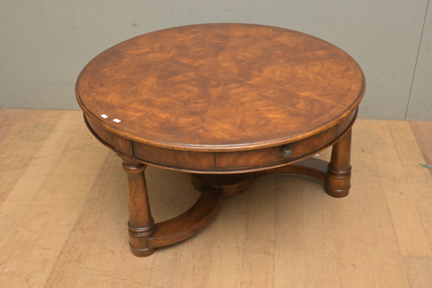 A LARGE VINTAGE ENGLISH WALNUT CIRCULAR COFFEE TABLE WITH DRAWER (A/F) (52H X 102D CM) (PLEASE NOTE THIS HEAVY ITEM MUST BE REMOVED BY CARRIERS AT THE CUSTOMER'S EXPENSE. LEONARD JOEL STAFF CANNOT ASSIST CARRYING THIS ITEM) (X-LARGE ITEM)