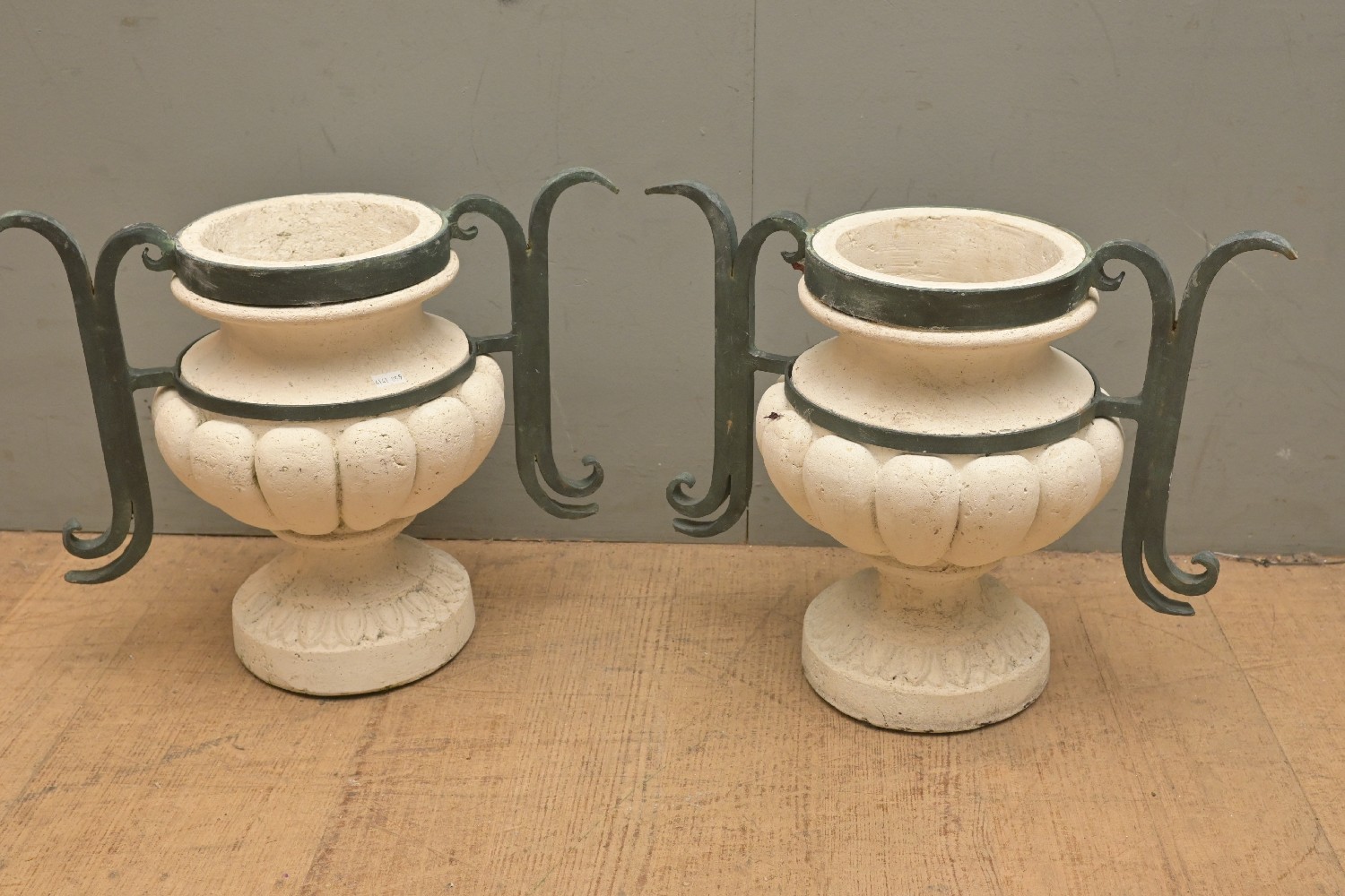 A PAIR OF 1950S FRENCH WROUGHT IRON AND RECONSTITUTED STONE PLANTER URNS (36H X 44W X 26D CM) (LEONARD JOEL DELIVERY SIZE: X-LARGE)