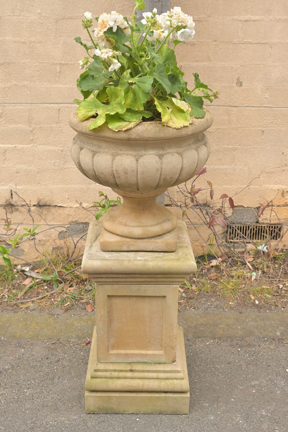 A RECONSTITUTED SANDSTONE POT WITH PLANT ON STAND (A/F) (PLEASE NOTE THIS HEAVY ITEM MUST BE REMOVED BY CARRIERS AT THE CUSTOMER'S EXPENSE. LEONARD JOEL STAFF CANNOT ASSIST CARRYING THIS ITEM) (X-LARGE ITEM)