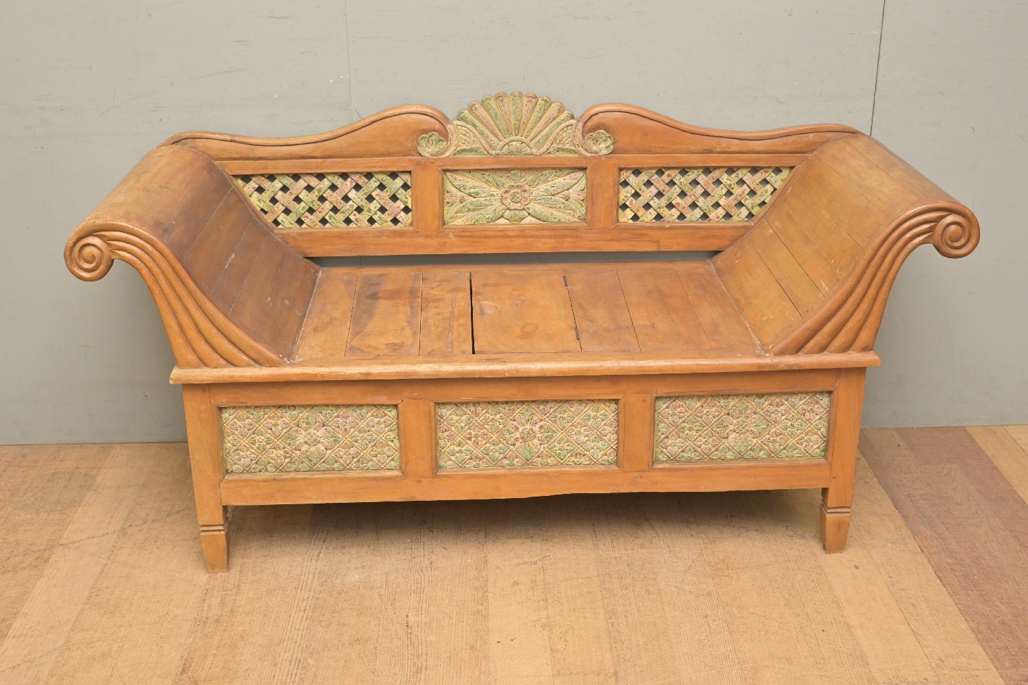 A HARDWOOD BENCH SEAT WITH CARVED AND PAINTED DETAILS , WITH A STORAGE COMPARTMENT BENEATH THE SEAT (A/F) (81H X 158W X 56D CM) (LEONARD JOEL DELIVERY SIZE: X-LARGE)