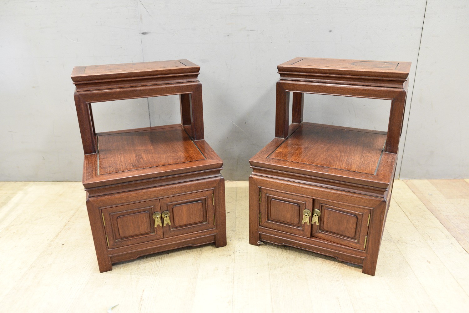 A PAIR OF CHINESE ROSEWOOD TWO-TIER SIDE TABLES (A/F) (56H X 41W X 45D CM) (LEONARD JOEL DELIVERY SIZE: LARGE)