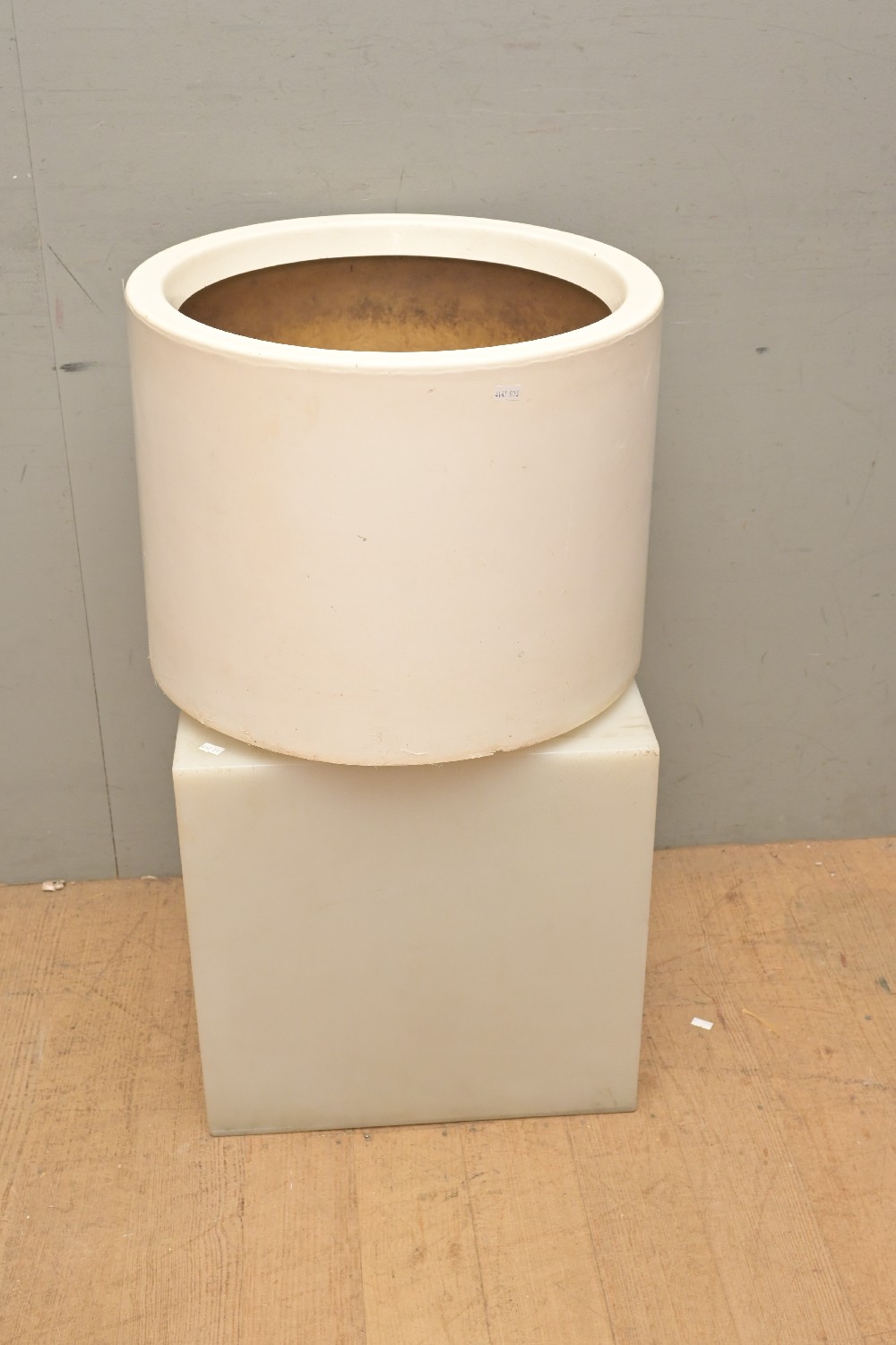 A VINTAGE CIRCULAR FIBERGLASS PLANTER AND SQUARE FORM STOOL (A/F) (36H X 47D CM) (LEONARD JOEL DELIVERY SIZE: LARGE)