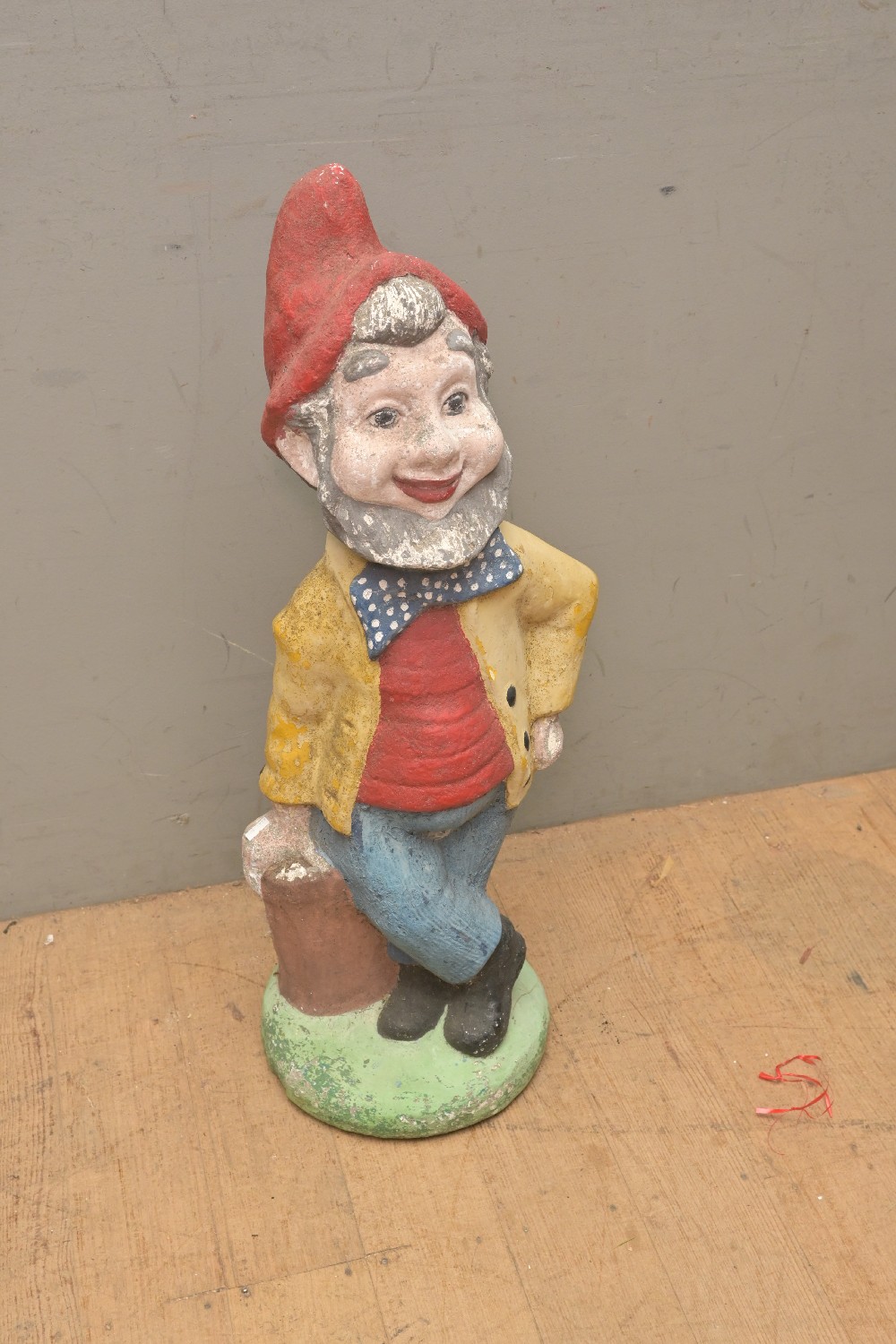 A LARGE HAND PAINTED HAPPY GNOME FIGURE (A/F) (76H CM) (THIS HEAVY ITEM MUST BE REMOVED BY CARRIERS AT THE CUSTOMER'S EXPENSE. LEONARD JOEL STAFF WILL NOT ASSIST CARRYING THIS ITEM)