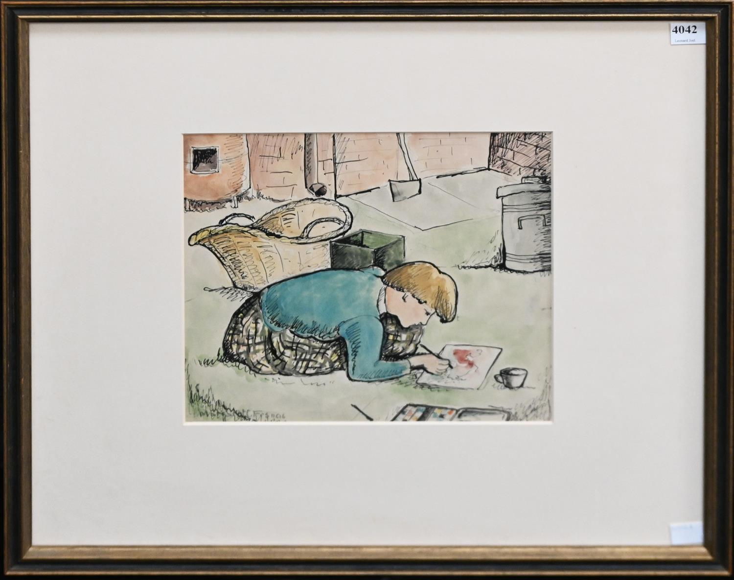 § MARGARET FRANCIS, THE BACKYARD ARTIST C.1940S, INK AND WASH ON PAPER, SIGNED LOWER LEFT, 24 X 26CM, FRAME SIZE: 47 X 52.5CM