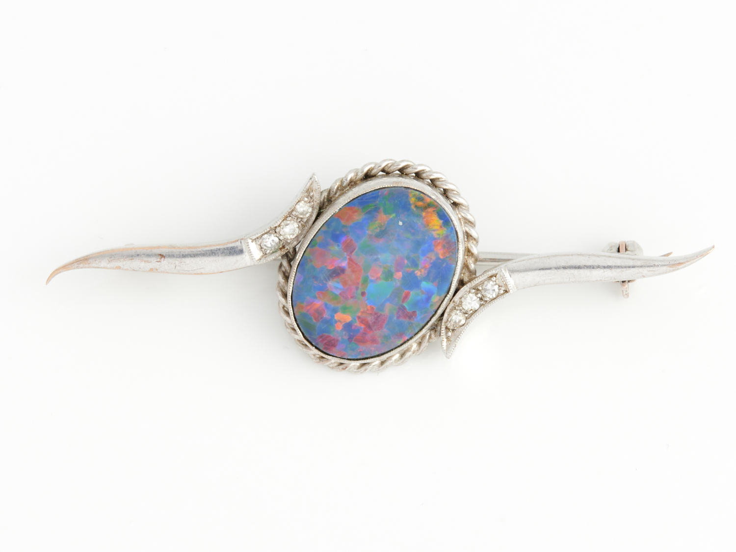 AN OPAL DOUBLET AND DIAMOND BROOCH IN 9CT WHITE GOLD, 55MM, 5.5GMS