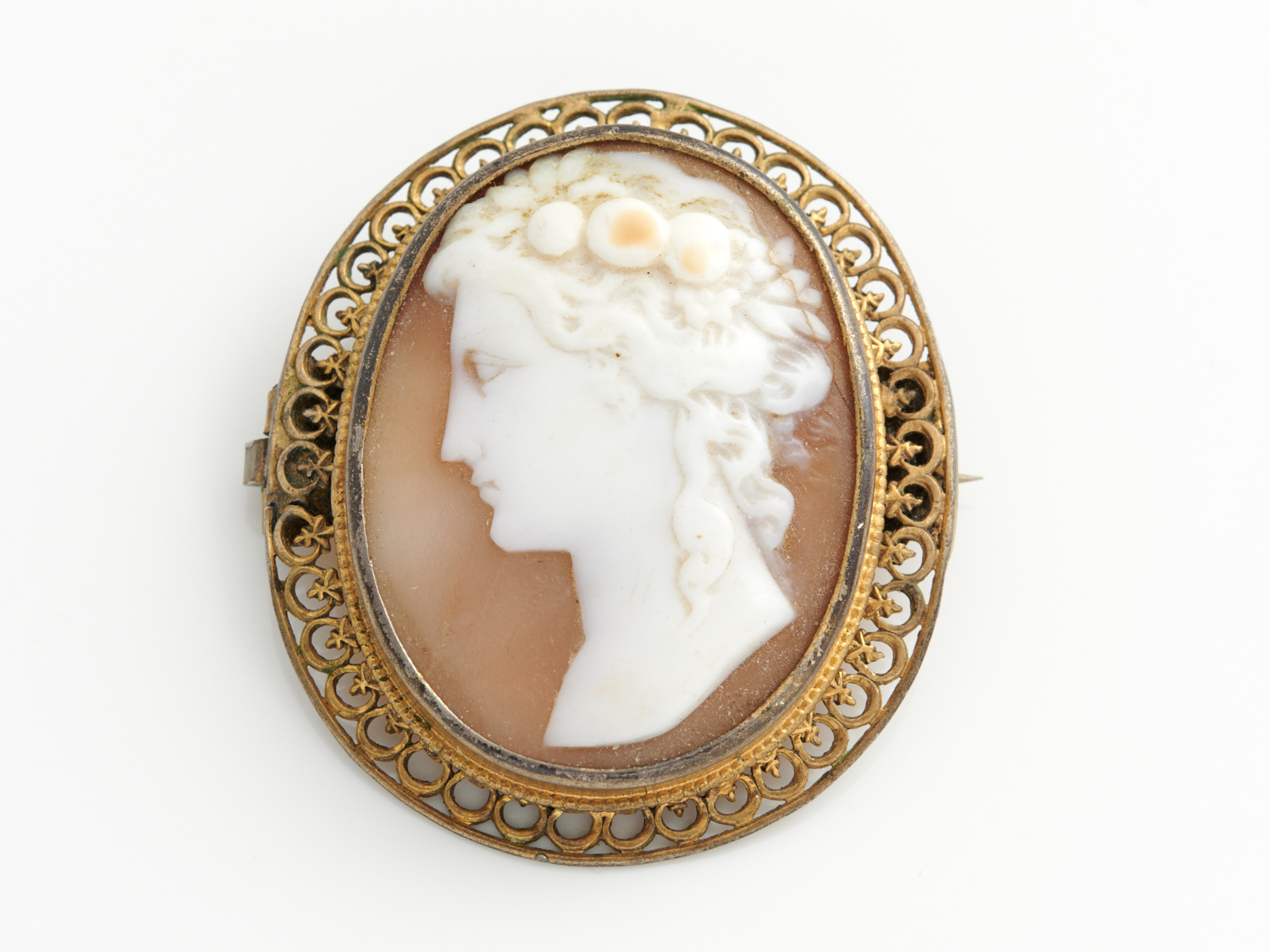 A VINTAGE CAMEO IN GOLD PLATE, 40 X 35MM