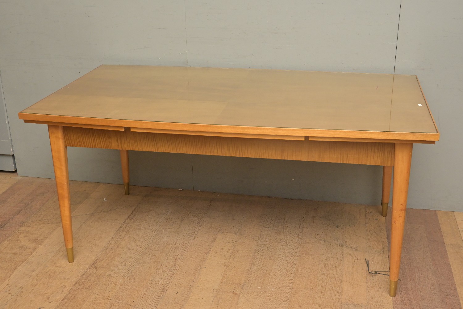 A JAKOB RUDOWSKI EXTENDING DINING TABLE, WITH GLASS TOP (A/F) (77H X 170W X 92D CM ) (THIS HEAVY ITEM MUST BE REMOVED BY CARRIERS AT THE CUSTOMER'S EXPENSE. LEONARD JOEL STAFF WILL NOT ASSIST CARRYING THIS ITEM) (LARGE ITEM)