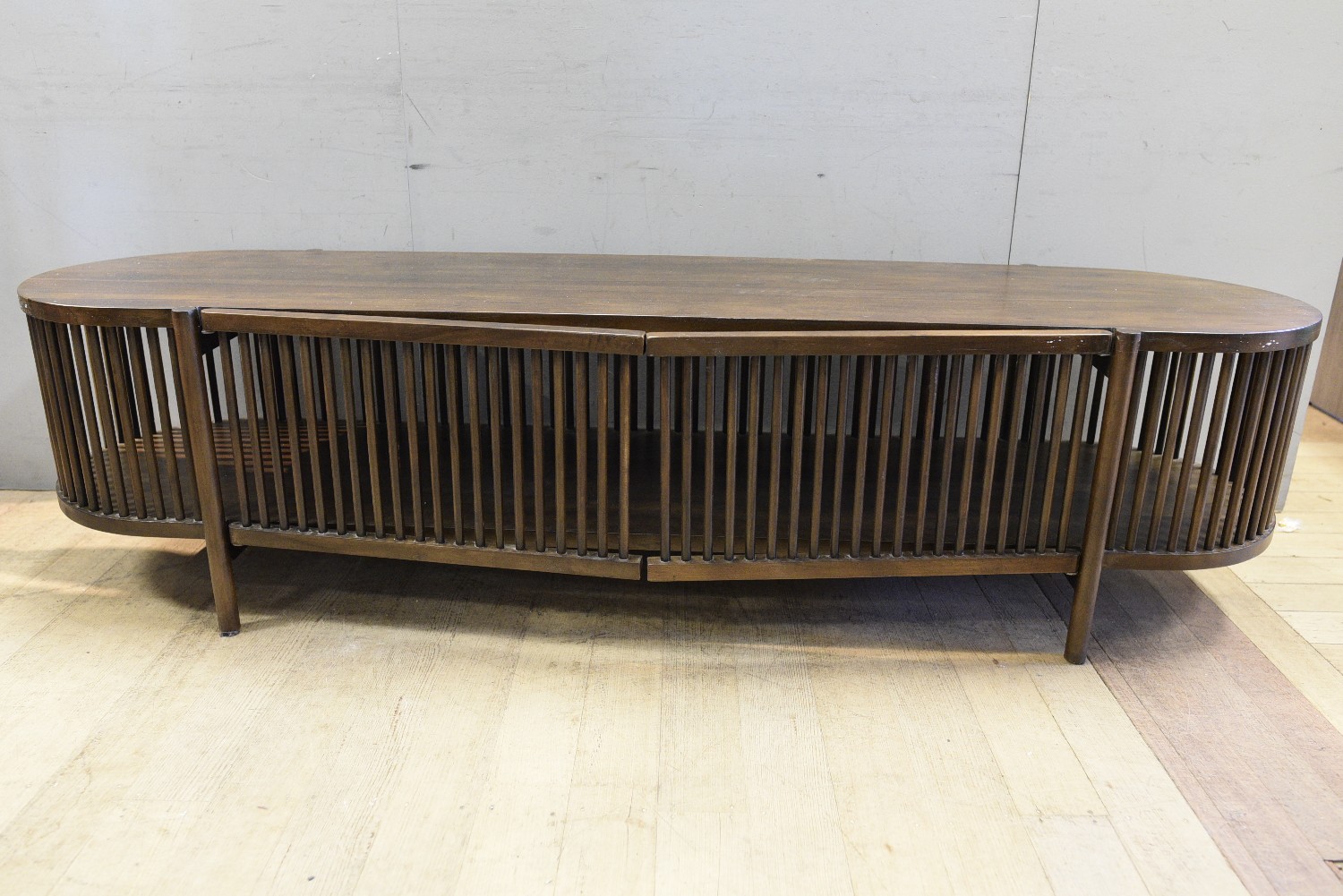 A CONTEMPORARY EUROPEAN STYLE LOW SIDEBOARD IN TEAK (A/F) (51H X 200W X 53D) (THIS HEAVY ITEM MUST BE REMOVED BY CARRIERS AT THE CUSTOMER'S EXPENSE. LEONARD JOEL STAFF WILL NOT ASSIST CARRYING THIS ITEM) (HEAVY LARGE ITEM)