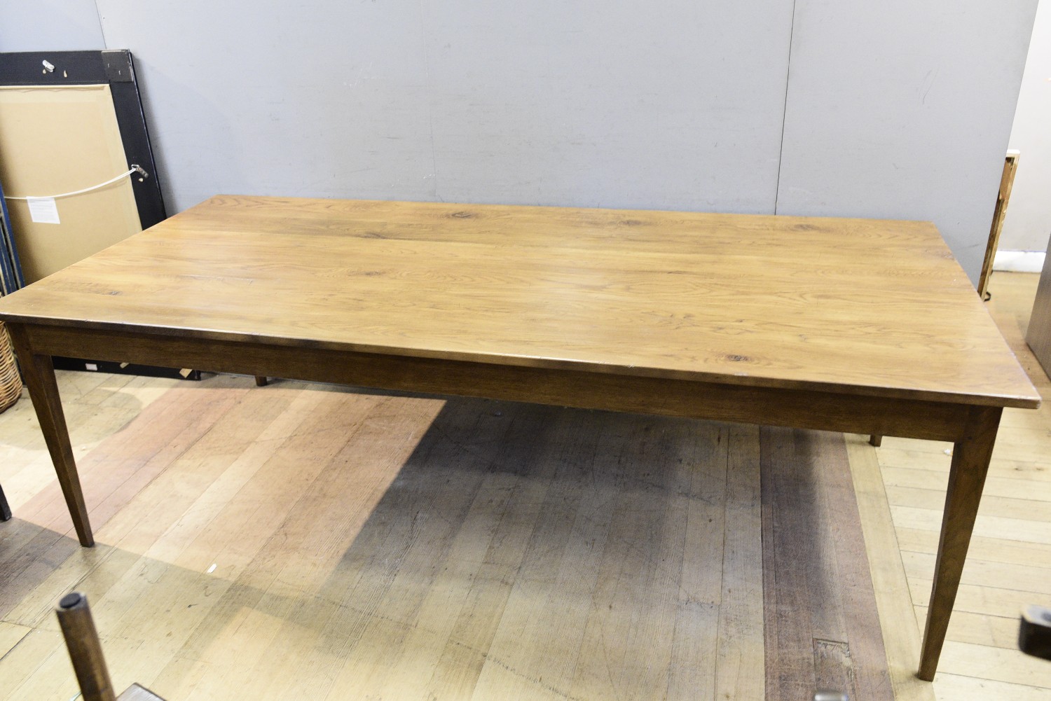 A FARMHOUSE-TYPE OAK DINING TABLE (76H X 240W X 110D CM) (PLEASE NOTE THIS HEAVY ITEM MUST BE REMOVED BY CARRIERS AT THE CUSTOMER'S EXPENSE. LEONARD JOEL STAFF CANNOT ASSIST CARRYING THIS ITEM) (X-LARGE ITEM)