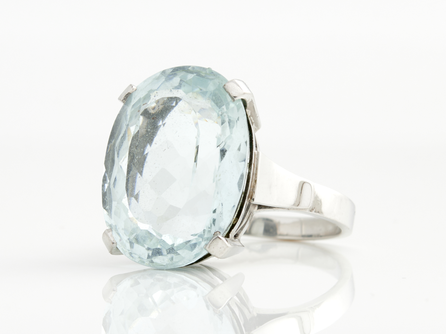 AN AQUAMARINE RING IN 18CT WHITE GOLD, SIZE P, 8.4GMS