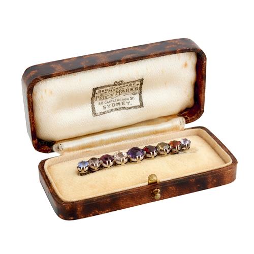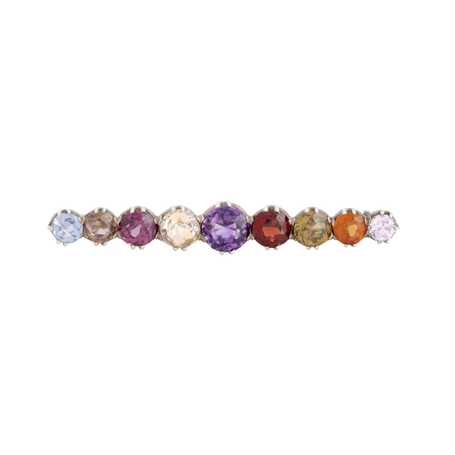 Of bar design, claw-set with multi-coloured gems including amethyst, tourmaline, garnet, sapphire, topaz, citrine and chrysoberyl, length 48mm.