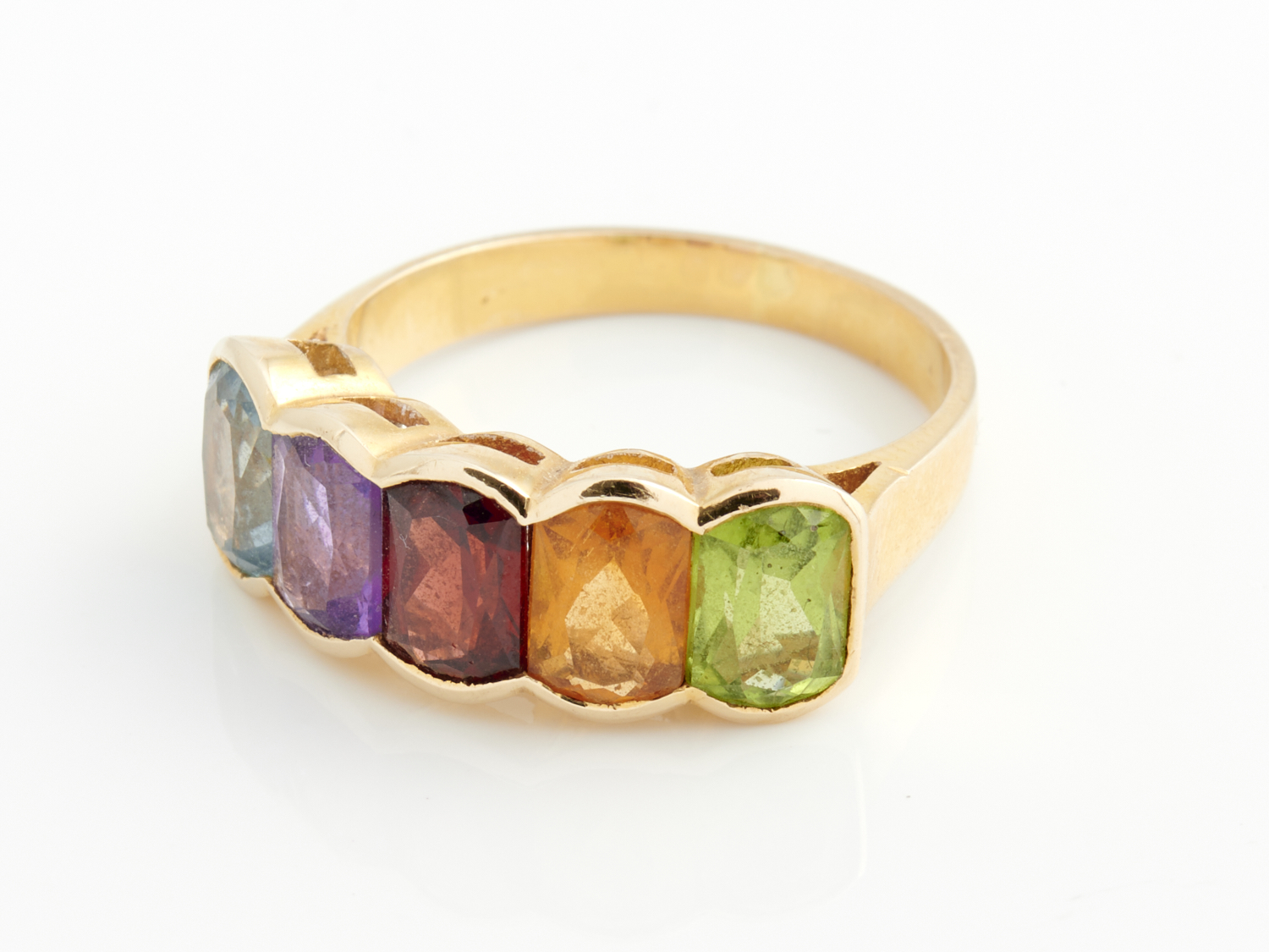 A GEM-SET RING IN 14CT GOLD, SIZE O, 4.5GMS
