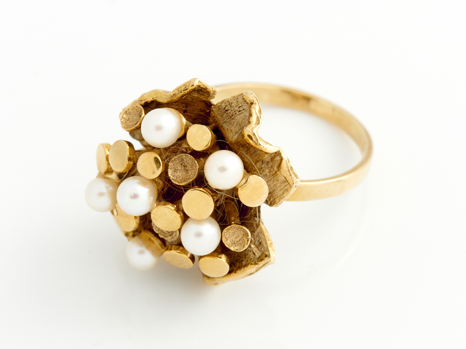 A CULTURED PEARL COCKTAIL RING IN 14CT GOLD, SIZE M, 7.69GMS