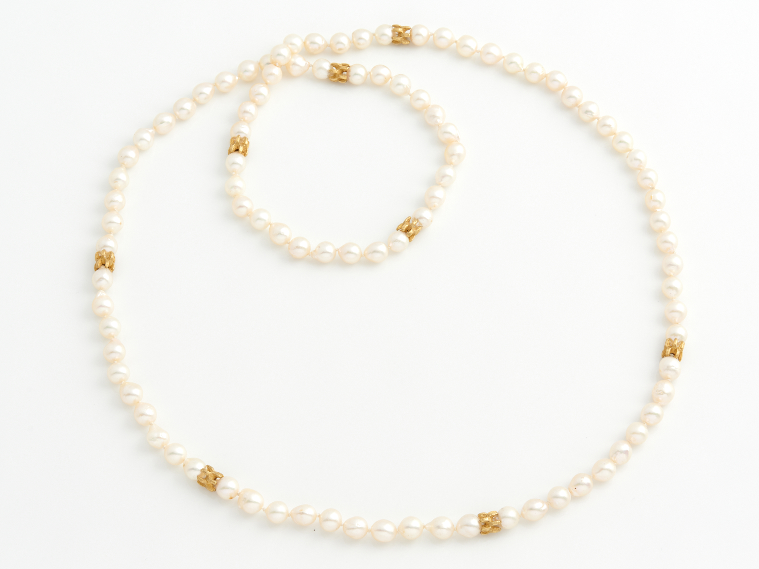 A LONG SEMI BAROQUE CULTURED PEARL NECKLACE FEATURING SPACERS IN 18CT GOLD, LENGTH APPROXIMATELY 860MM