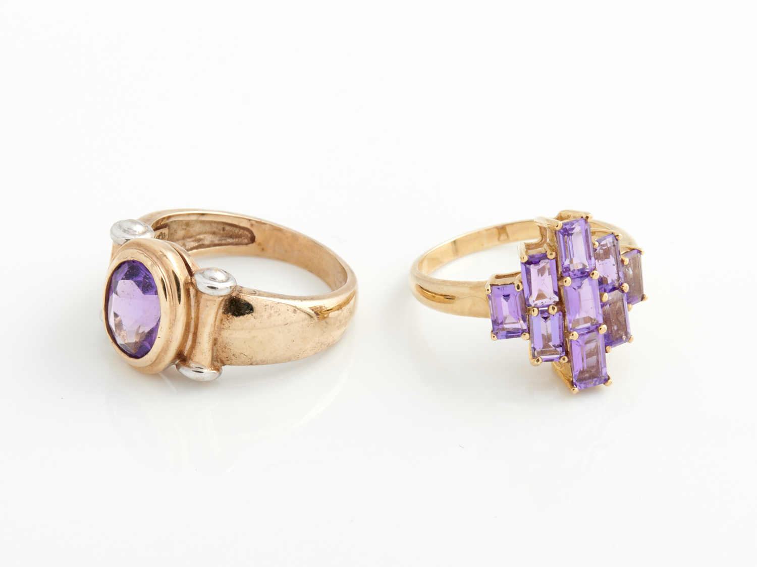 TWO AMETHYST RINGS IN 9CT GOLD, SIZE O - P, 8.38GMS