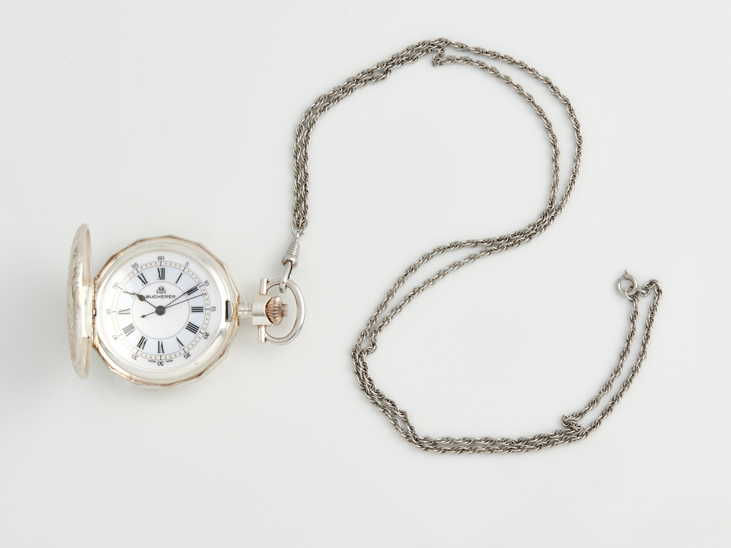 BUCHERER, A HUNTINGCASED POCKETWATCH IN SILVER, ACCOMPANIED WITH A CHAIN IN BASE METAL AND A BOX