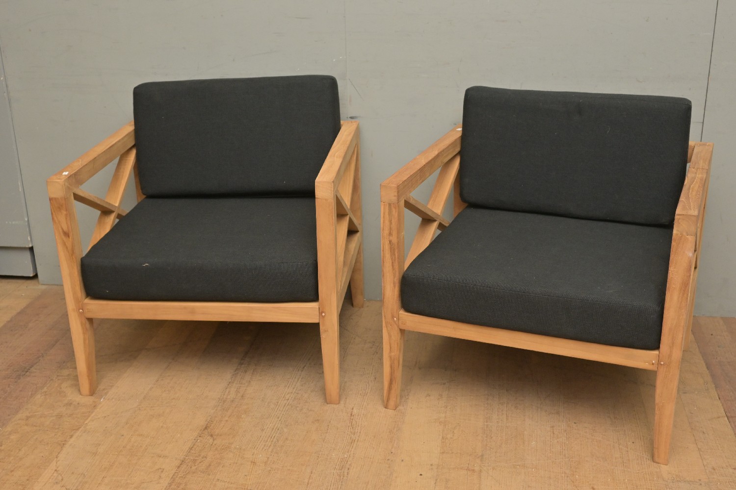 A PAIR OF TEAK OUTDOOR CARVER CHAIRS (65H X 75W X 67D CM) (LEONARD JOEL DELIVERY SIZE: X-LARGE)