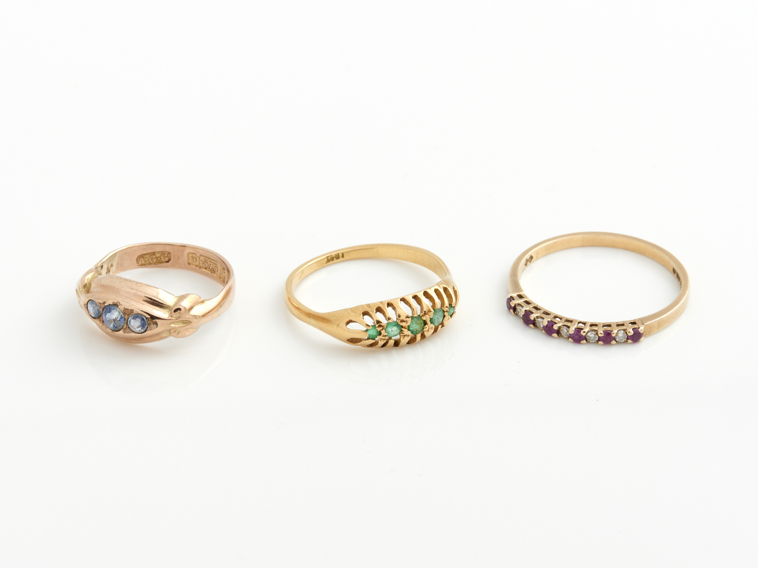 A COLLECTION OF THREE GEM-SET RINGS INCLUDING ONE IN 9CT GOLD AND ONE IN 18CT GOLD, SIZES G, M AND O