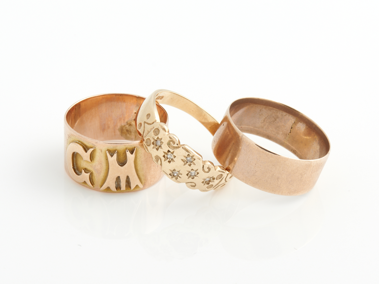 THREE BAND RINGS IN 9CT GOLD, INCLUDING ONE DIAMOND SET, SIZE O-P, P, K-M, 9.0GMS