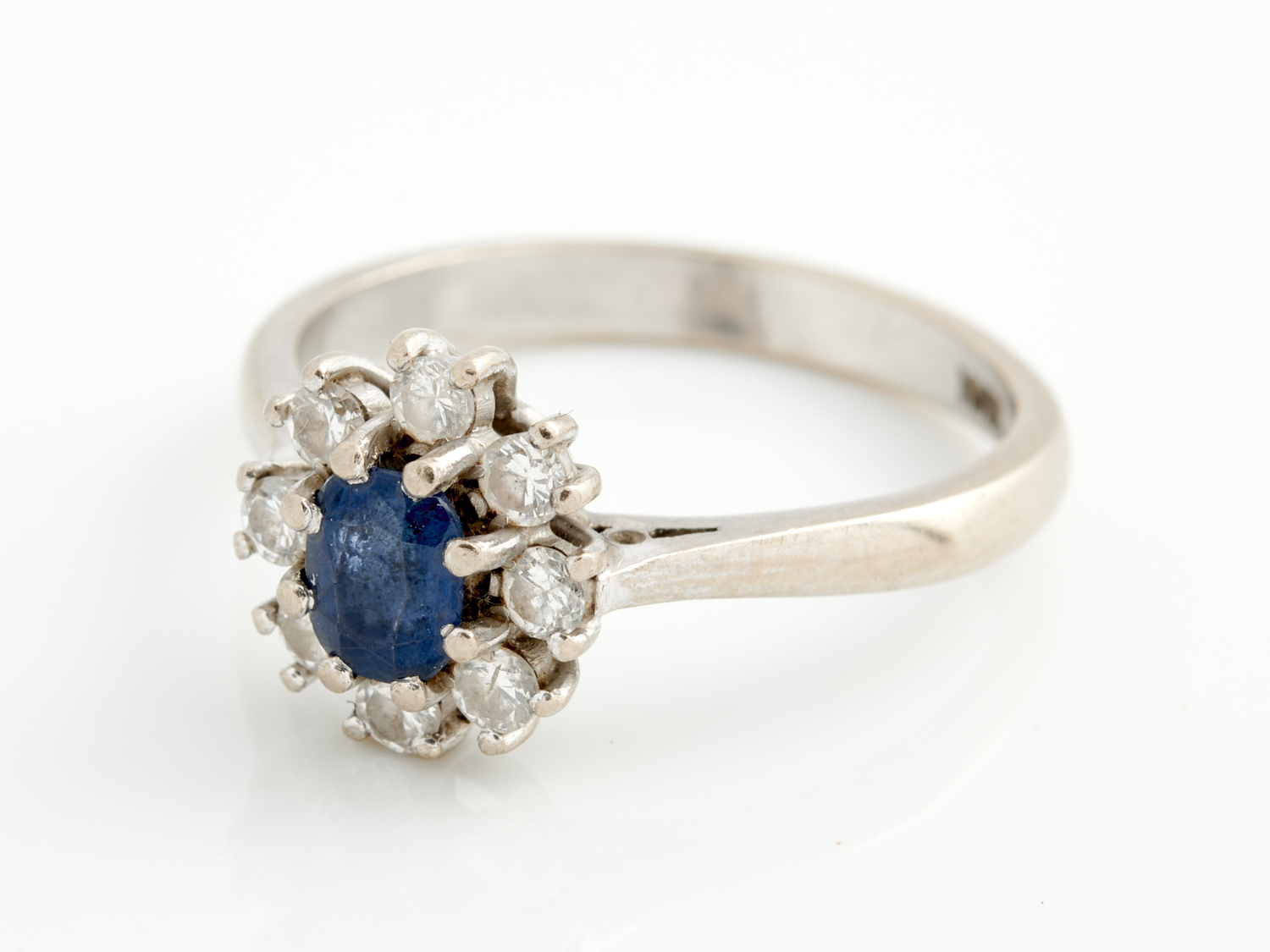 A SAPPHIRE AND DIAMOND RING IN 18CT WHITE GOLD, SIZE O 1/2, 4.2GMS