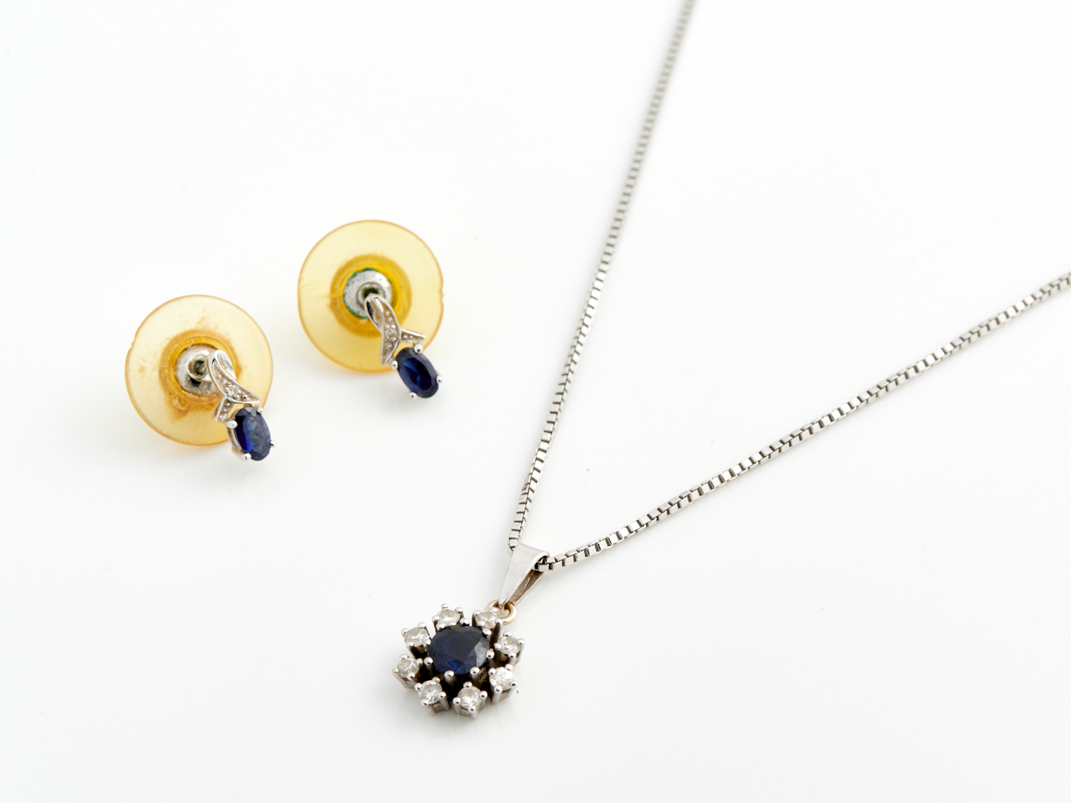 A SAPPHIRE AND DIAMOND CLUSTER PENDANT IN 18CT WHITE GOLD TO A FINE CHAIN IN 9CT WHITE GOLD, TOGETHER WITH A PAIR OF SAPPHIRE AND DIAMOND EARRINGS IN 9CT WHITE GOLD, TO POST AND BUTTERFLY FITTINGS, TOTAL WEIGHT 5.3GMS