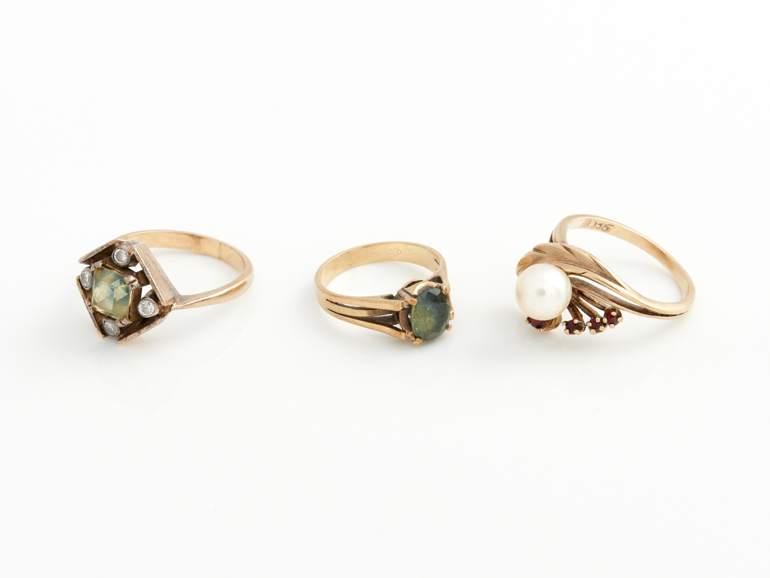A COLLECTION OF THREE GEM SET RINGS IN 9CT GOLD, SIZES H, L AND M, 9.3GMS
