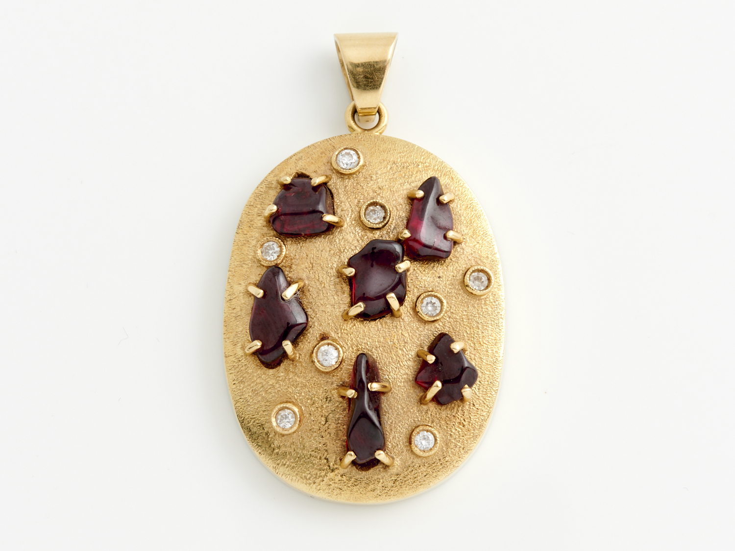 A GARNET AND WHITE STONE SET PENDANT IN 18CT GOLD, 9.33GMS, 33 X 26MM