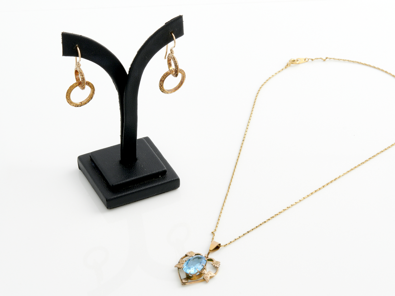 A PAIR OF DOUBLE RING EARRINGS IN LOW CARAT GOLD TO SHEPHERD HOOKS, TOGETHER WITH A GEM-SET HEART SHAPED PENDANT IN GOLD PLATE, 420MM