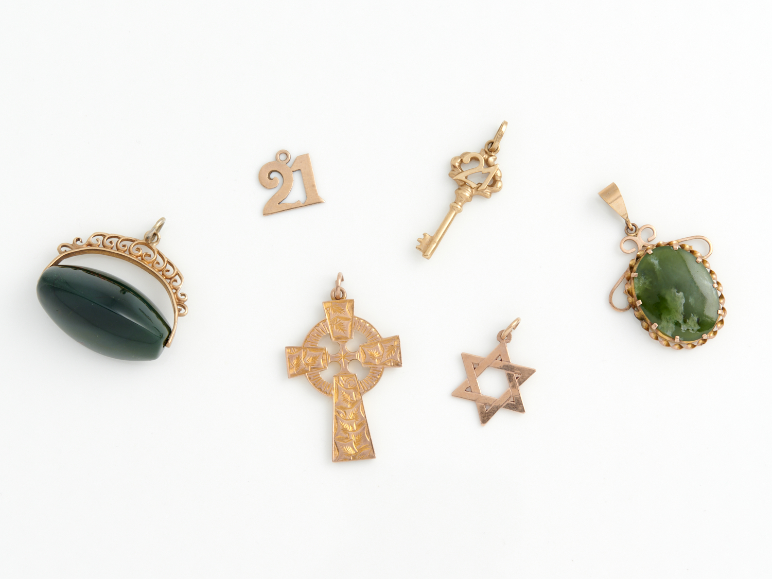 FOUR PENDANTS IN 9CT AND 14CT GOLD, 4.31GMS, TOGETHER WITH TWO HARD-STONE MOUNTED PENDANTS IN 9CT AND LOW CARAT GOLD