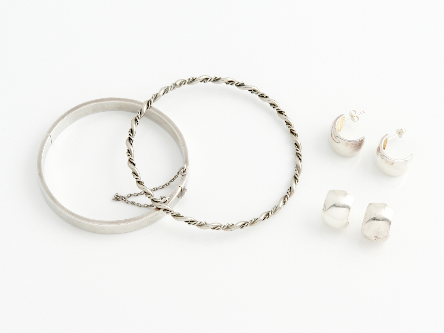 A COLLECTION OF JEWELLERY IN SILVER COMPRISING TWO PAIRS OF EARRINGS AND TWO BANGLES