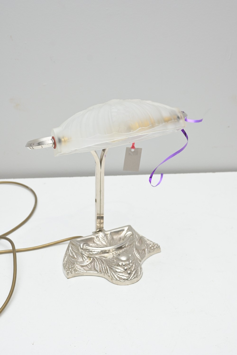 AN ART DECO STYLE CHROME AND PRESSED GLASS DESK LAMP (A/F) (34H CM) (LEONARD JOEL DELIVERY SIZE: MEDIUM)