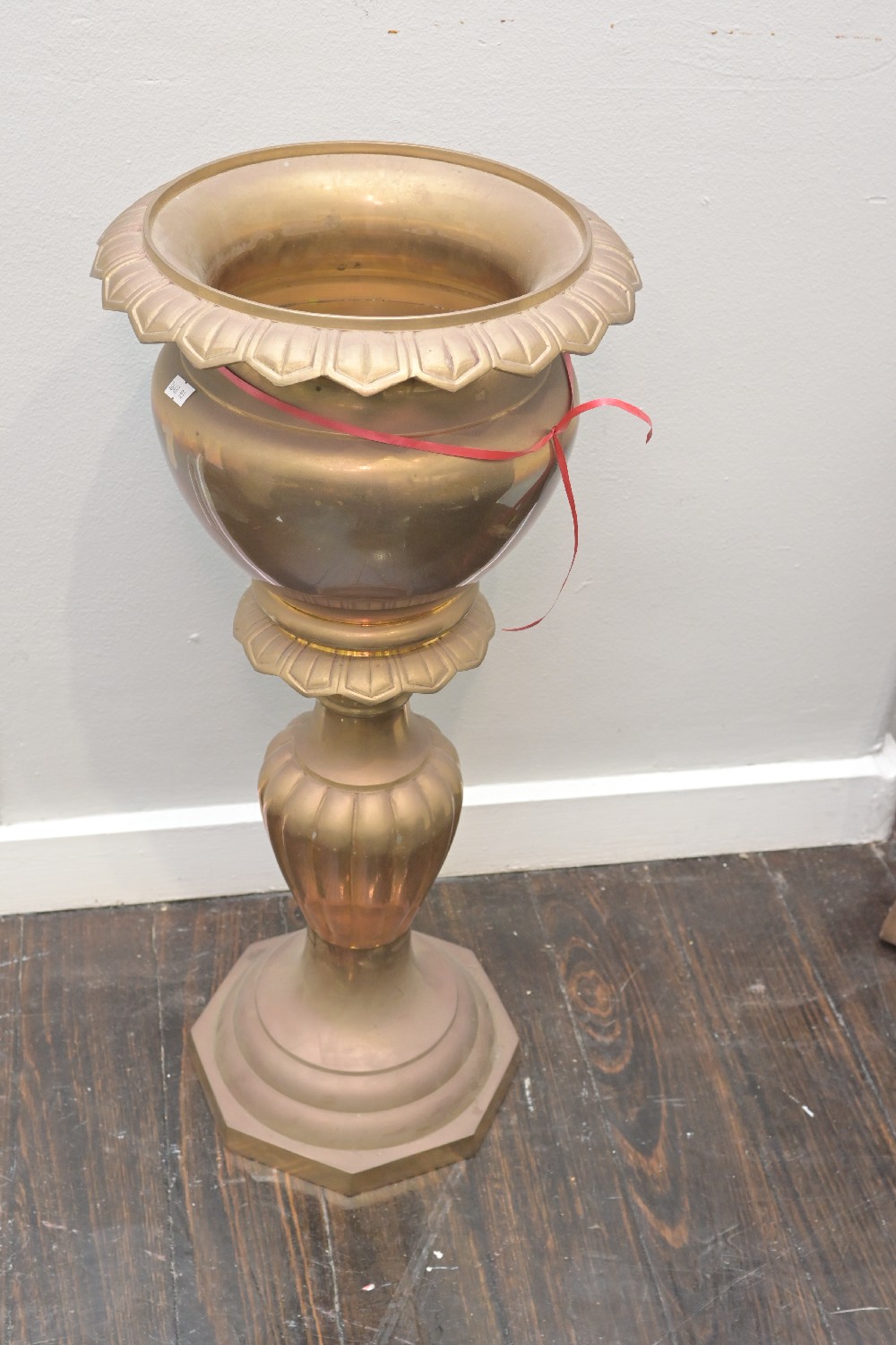 A BRASS JARDINIERE ON INTEGRAL PEDESTAL (A/F) (68H X 29DIA CM) (LEONARD JOEL DELIVERY SIZE: LARGE)