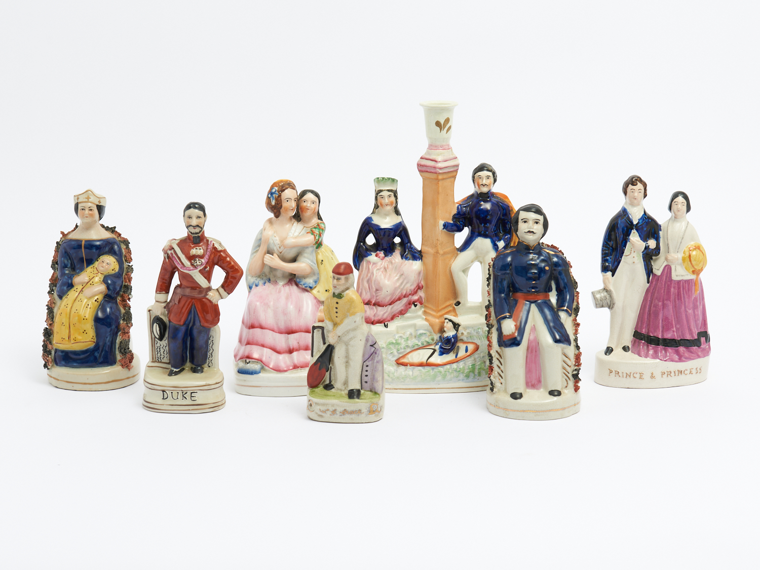 A COLLECTION OF SEVEN STAFFORDSHIRE FIGURES INCL. MANY ROYALIST THEMED PIECES, ONE A CANDLESTICK H.25.5CM (TALLEST), LEONARD JOEL DELIVERY SIZE: LARGE
