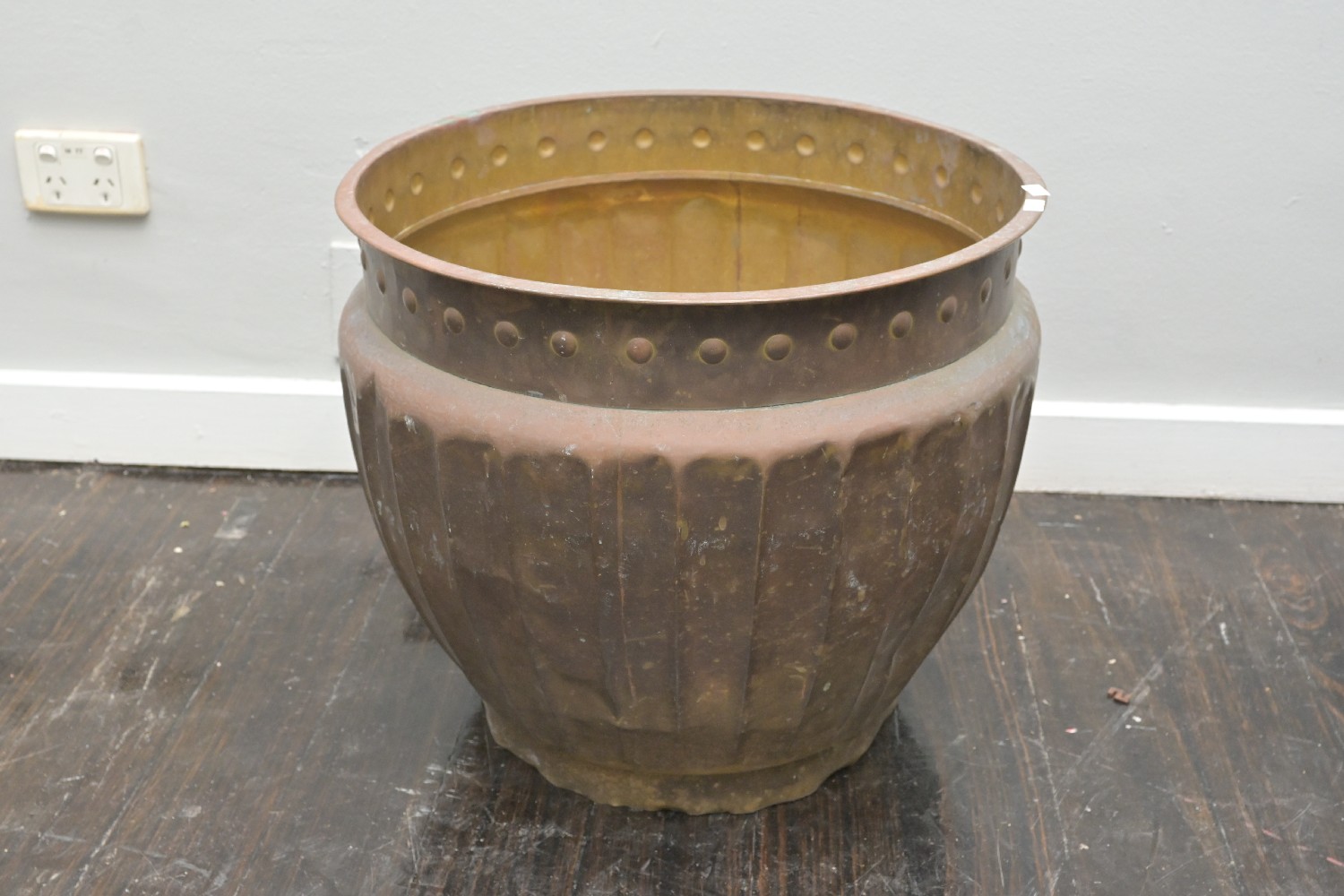 A LARGE BRASS JARDINIERE (A/F) (40H X 48DIA CM) (LEONARD JOEL DELIVERY SIZE: LARGE)