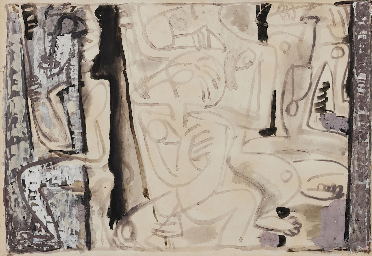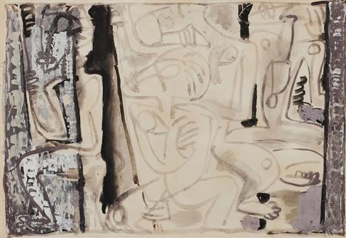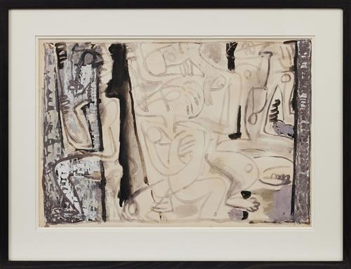 In the present lot this feeling of movement is conveyed by repetitive sweeping curved lines which coalesce into a busy overall graphic. If it weren't for the literal title, the composition may be difficult for a viewer to make sense of. However, with the aid of the title we see these lines coming together to form several figures interwoven in a variety of positions. The image recalls that of Fairweather's work on paper, Pied-à-terre, c.1950, in the Art Gallery of New South Wales. According to the Art Gallery of New South Wales, during the summer of 1950-51, when Fairweather was living in an abandoned patrol boat on the shores of Darwin Harbour, he was at a crossroads both artistically and personally. His art from this period demonstrates that he was wrestling with his identity as an Englishman abroad and an artist whose work was rooted firmly in the Australian landscape. (2)