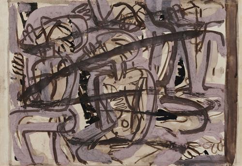 The compositional elements within Figure Group are characteristic of Fairweather's distinctive style and are present throughout his oeuvre from the mid-century onwards. In these lines we see the influence of Chinese calligraphy, and his appreciation of Chinese language in the signature and inscription in Chinese characters in the lower right corner. In an interview with Craig McGregor in 1968 Fairweather said: The Chinese have quite a different idea of painting from us. The movement, the stroke of the hand counts so much for them. They never draw a straight line. And it's the same for me. It's given me a sensitiveness towards line that I didn't have. (3)