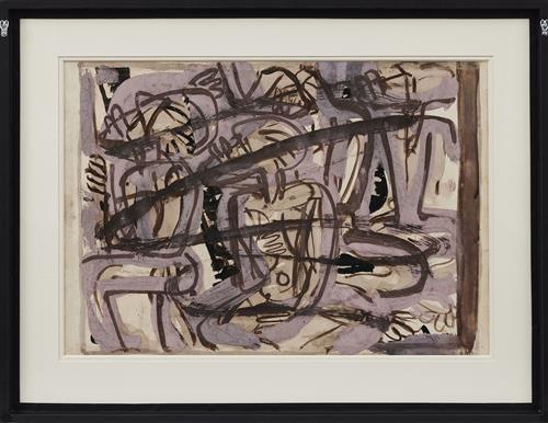 Upon reframing this artwork, it was found to have another previously unknown work on the reverse. This work is unsigned but appears to be a preparatory work for the final piece on the other side. Although the composition appears somewhat complete it seems Fairweather has "crossed out" the image, with several sweeping brush strokes of black ink across the width of the page indicating he was unhappy with its result. It was a surprising discovery which offers a rare insight into the artistic process of one of Australia's most interesting and unique modern painters.