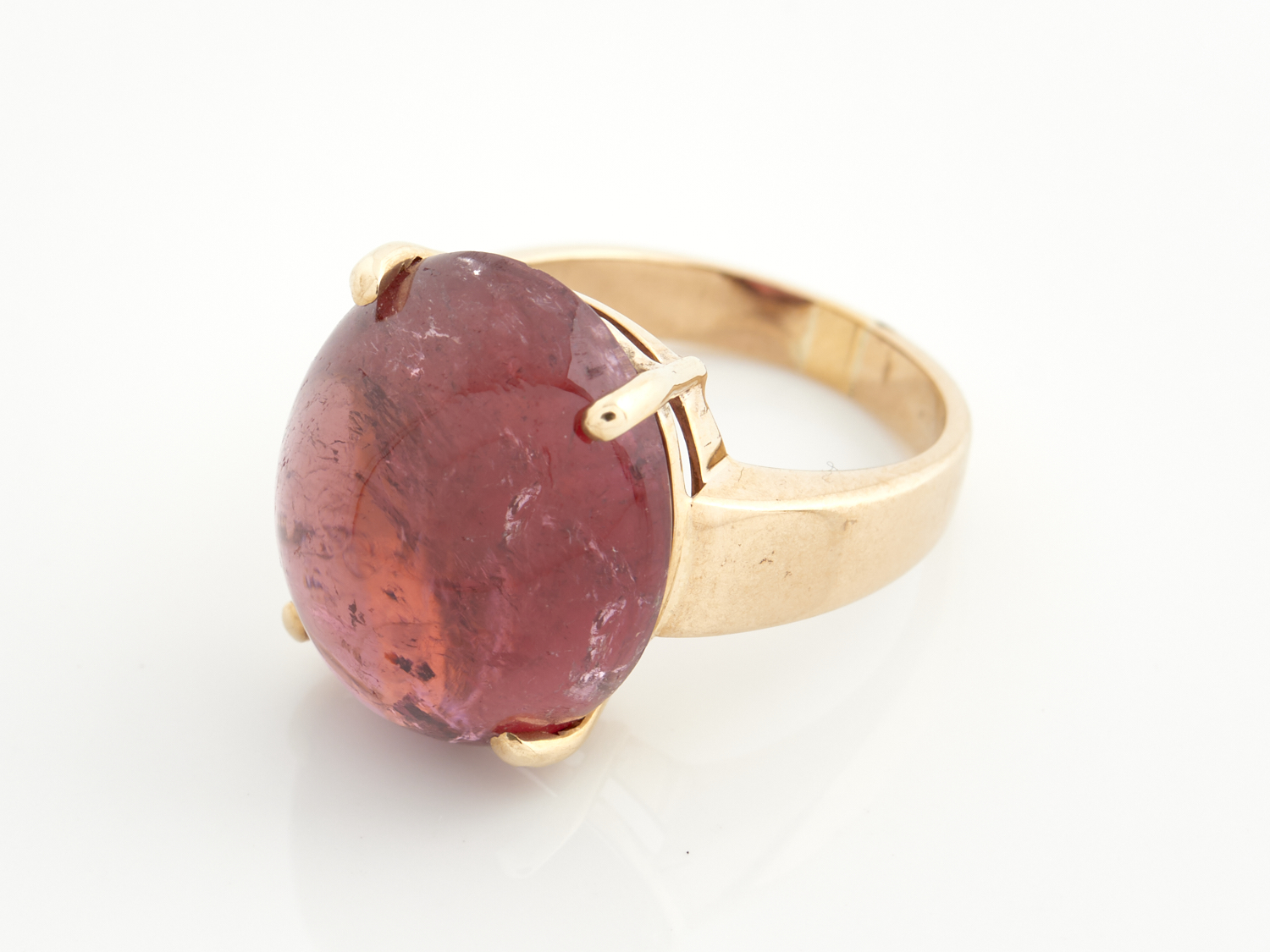 JAN LOGAN, A PINK TOURMALINE RING IN 9CT GOLD, THE CABOCHON CUT TOURMALINE WITH AN ESTIMATED TOTAL WEIGHT OF 18.7CTS, SIZE L, 7.9GMS