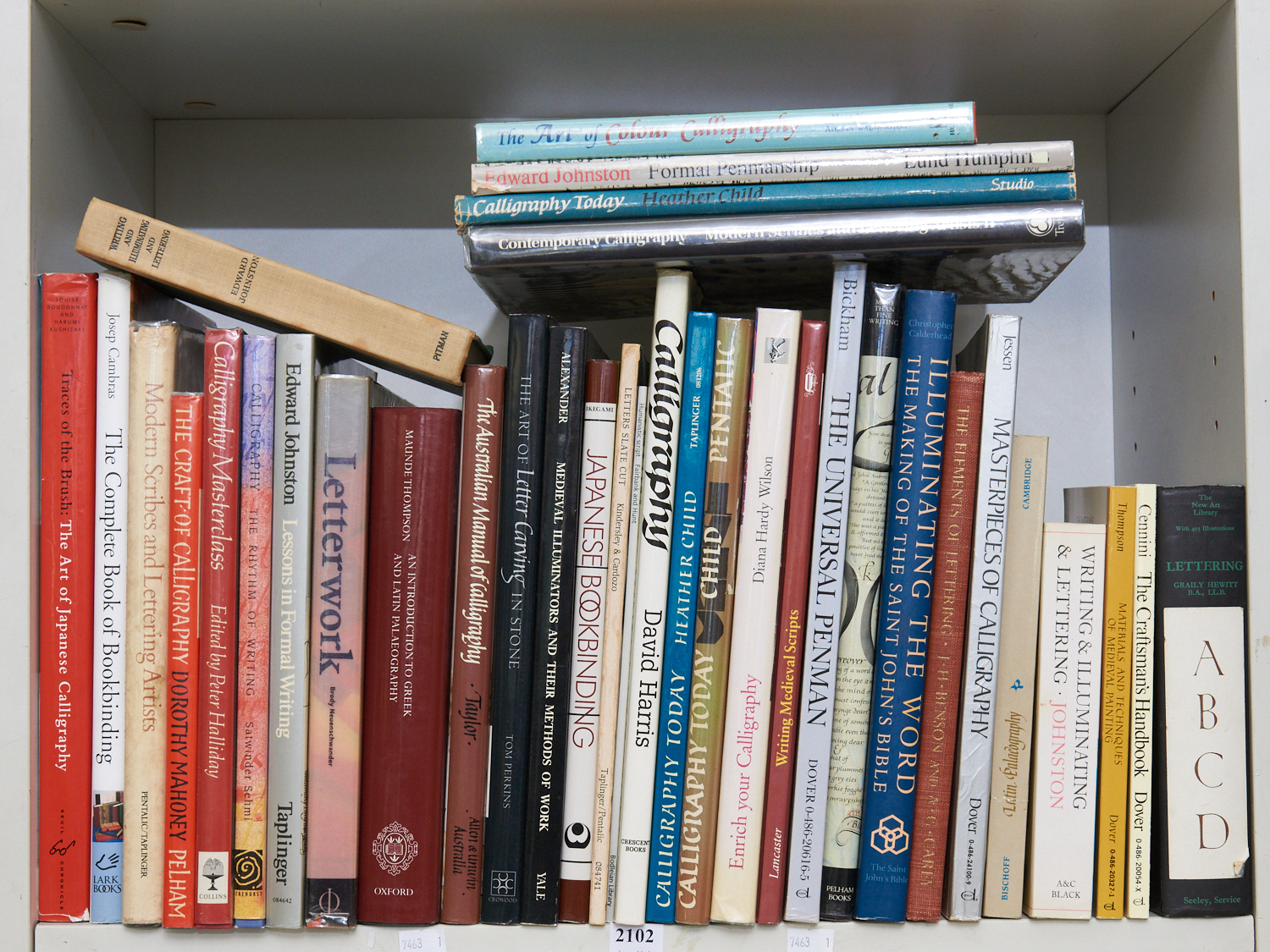 A SHELF OF REFERENCE BOOKS ON LETTER WRITING, CALLIGRAPHY, AND BOOK BINDING, LEONARD JOEL DELIVERY SIZE: LARGE