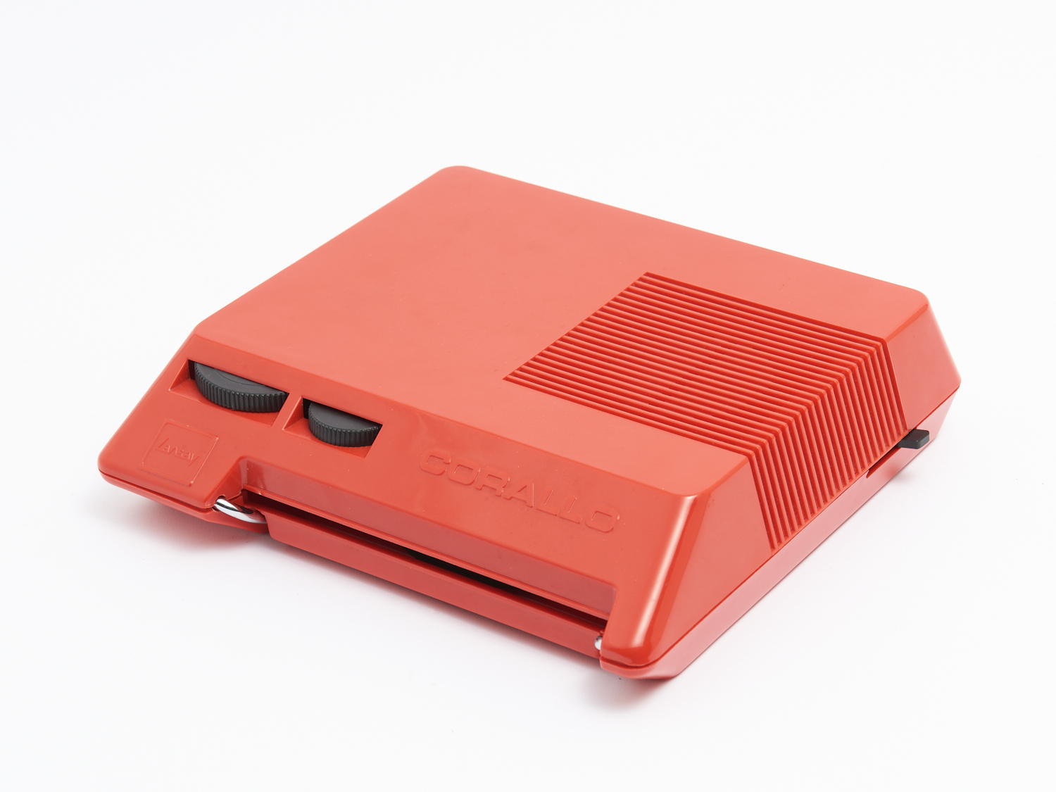 A BOXED 1960S ITALIAN RED WILCO CORALLO PORTABLE RECORD PLAYER W.28CM, LEONARD JOEL DELIVERY SIZE: MEDIUM