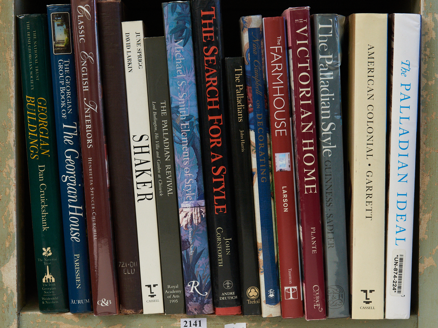 A SHELF OF REFERENCE BOOKS ON ARCHITECTURE INCLUDING GEORGIAN BUILDINGS, THE GEORGIAN HOUSE, AND AMERICAN COLONIAL LEONARD JOEL DELIVERY SIZE: LARGE