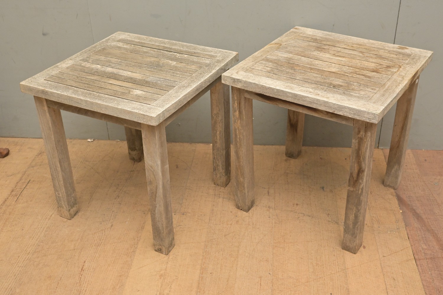 A PEAIR OF TEAK OUTDOOR COFFEE TABLES (A/F) (51H X 48W X 48D CM) (LEONARD JOEL DELIVERY SIZE: LARGE)