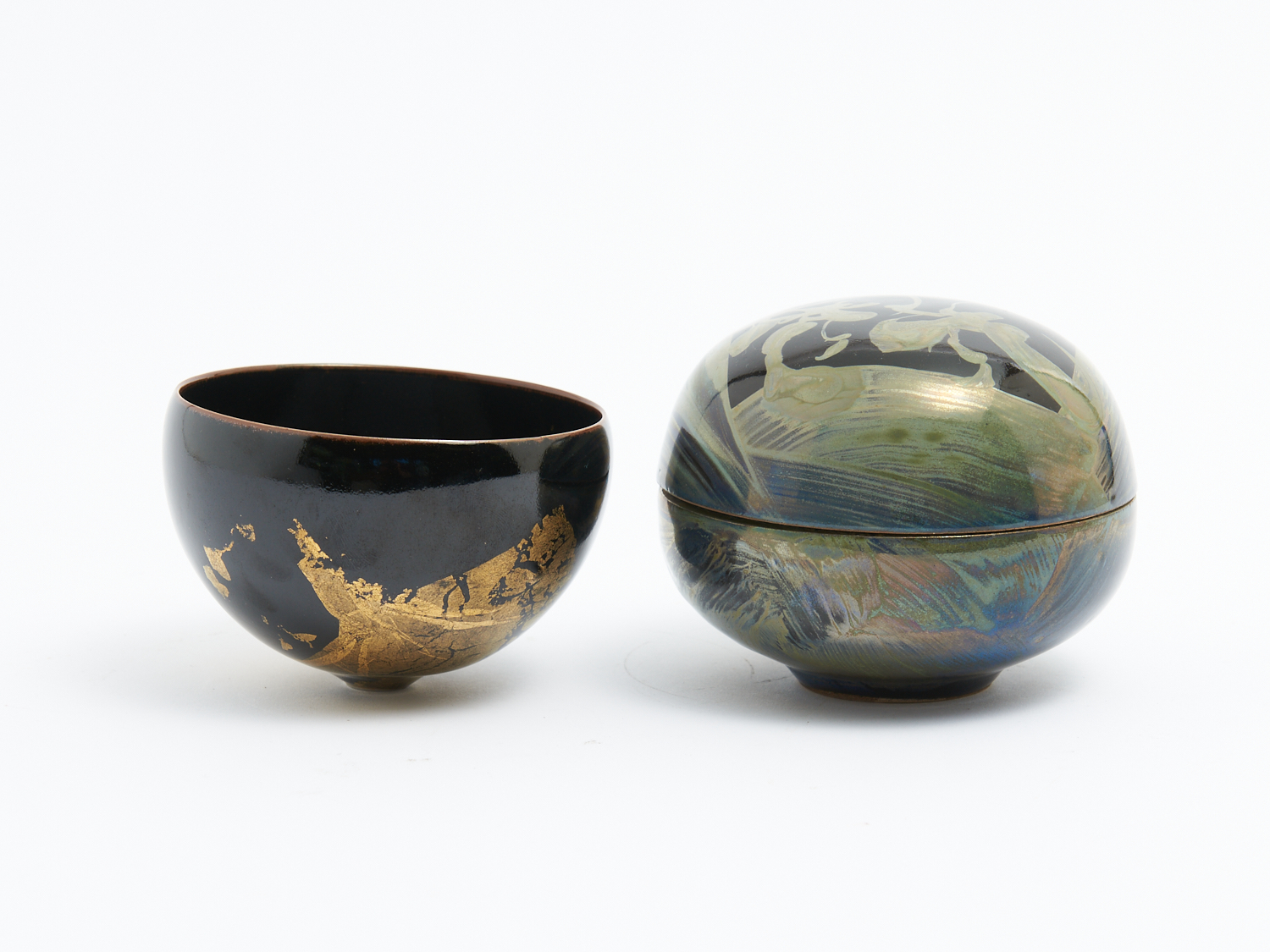 A PAIR OF GREG DALY PORCELAIN ITEMS INCL. A COVERED BOWL WITH LUSTRE GLASE AND BOWL WITH GOLD LEAF DECORATION H.12CM (LARGEST), LEONARD JOEL DELIVERY SIZE: SMALL