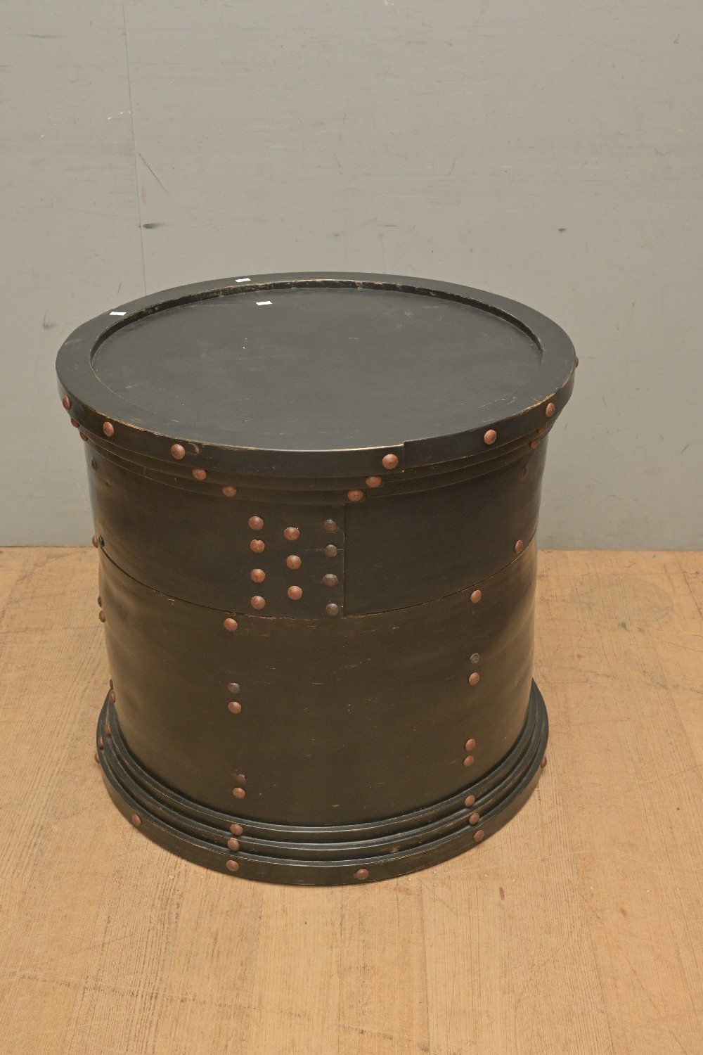 A BLACK LACQUERED DRUM FORM STORAGE TABLE (A/F) (65H X 70D CM) (LEONARD JOEL DELIVERY SIZE: LARGE)