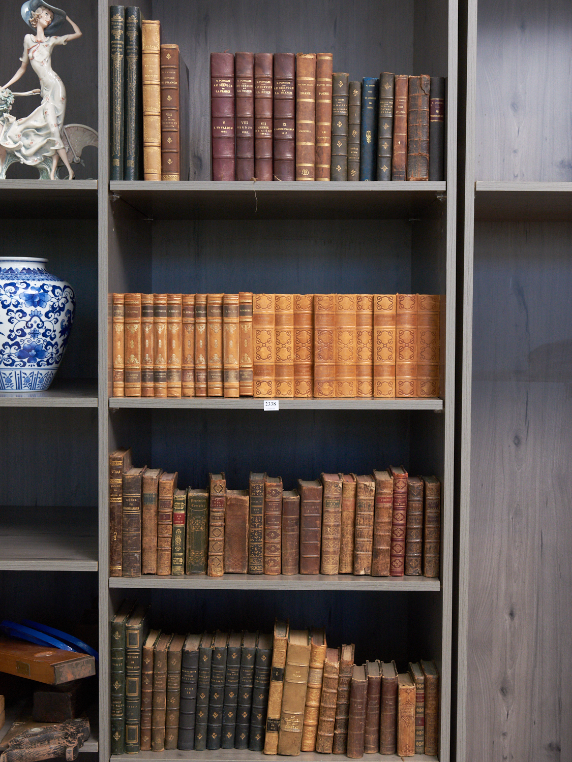 FOUR SHELVES OF DECORATIVE FRENCH ANTIQUE BINDINGS INCLUDING LEONARD JOEL DELIVERY SIZE: X-LARGE