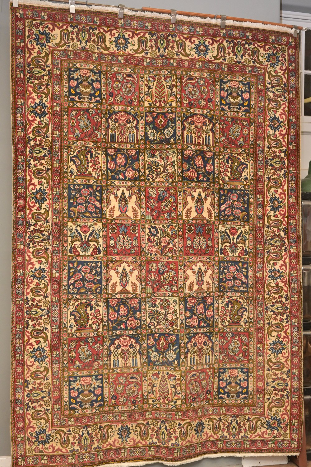 A VIBRANT PERSIAN BAKHTIAR SAMAN RUG, 100% DENSE WOOL, SOLID WEAVE, NATURAL DYES. HAND- KNOTTED TRIBAL BAKHTIARI WEAVE WITH TRADITIONAL "GARDEN" DESIGN WITH PANELS CONTAINING GARDEN THEMES OF WILLOW TREES, FLORAL SHRUBS, CYPRESS AND PAISLY, AND FLORAL SPRAYS IN URNS. BORDER OF PALMETTES; PAISLY MOTIFS. ALL OVER RICH COLOUR TONES. A REPUTABLE HARD-WEARING RUG. SIZE: 300 X 205 CM- ORIGIN: PERSIA – RRP: $6,900 DOCUMENTATION OF AUTHENTICITY INCLUDED.