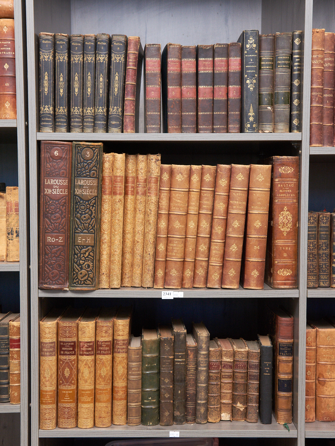THREE SHELVES OF FRENCH ANTIQUE BINDINGS INCLUDING TWO VOLUMES OF LAROUSSE DU XX SIECLE, LEONARD JOEL DELIVERY SIZE: X-LARGE